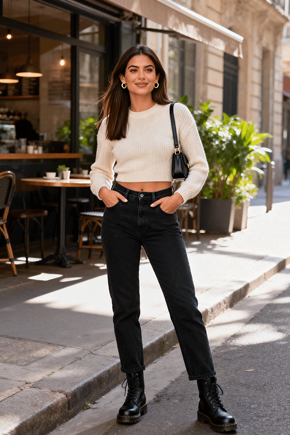 A cropped sweater adds a flattering silhouette, while combat boots inject an edgy element to the outfit. Perfect for casual days when you still want to look chic, this outfit works beautifully for everything from outdoor brunches to casual strolls around the city.