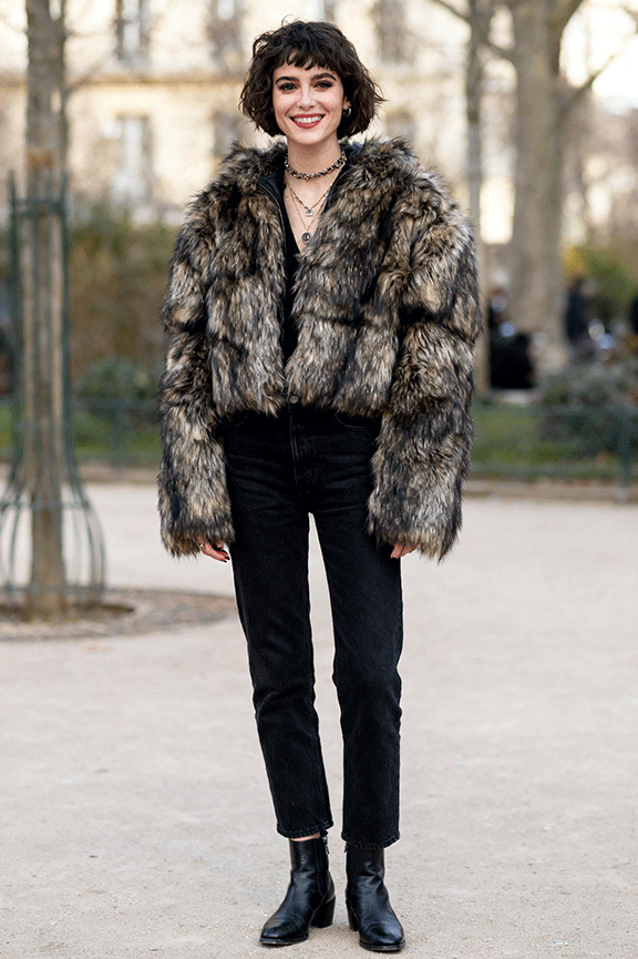 A faux fur jacket adds a touch of luxury, while black jeans keep the look chic and streamlined. Booties complete the outfit for a cozy yet stylish vibe, ideal for winter nights out or a chic dinner date.