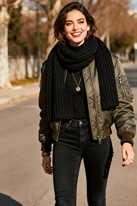 A bomber jacket adds an edgy touch, while the black jeans remain sleek and practical. A knit scarf provides warmth and style, making it ideal for winter meet-ups or quick coffee runs. Pair with combat boots for an added rugged appeal.