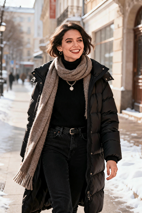 A long puffer coat and a turtleneck ensure optimal warmth for winter days. Paired with black jeans, this outfit is perfect for outdoor activities or city commutes. Add a wool scarf for extra coziness and style.