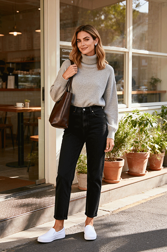 The turtleneck adds sophistication while the slip-on sneakers ensure comfort and ease. This outfit is your go-to for weekend coffee dates or when you need to balance comfort with a bit of refinement. Tucking the turtleneck into your jeans can create a more streamlined, flattering look.