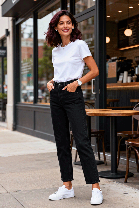 A classic combination that works in any casual setting, the white tee and black jeans offer a relaxed yet chic look. Pairing it with sneakers keeps it comfortable for a day of errands or casual hangouts. For an added touch, tuck in the tee to emphasize your waistline and create a more polished silhouette.