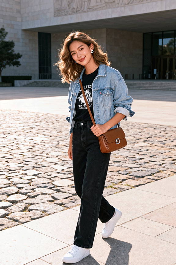 A bold graphic tee adds personality, while the denim jacket keeps it classic. Black straight-leg jeans ground the look, keeping it sleek and stylish. This ensemble works wonderfully for a fun weekend outing, whether it’s a day at the museum or grabbing lunch with friends.