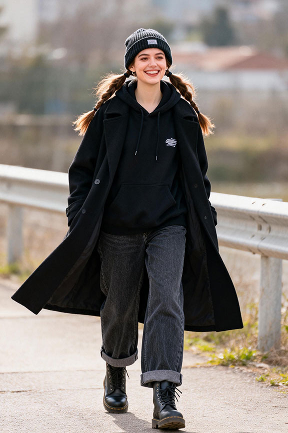 Keeping everything black simplifies the layering and avoids visual clutter. Straight jeans balance the relaxed hoodie without looking sloppy. Boots add weight at the bottom, which works well with a longer coat. This outfit feels effortless but still put together.