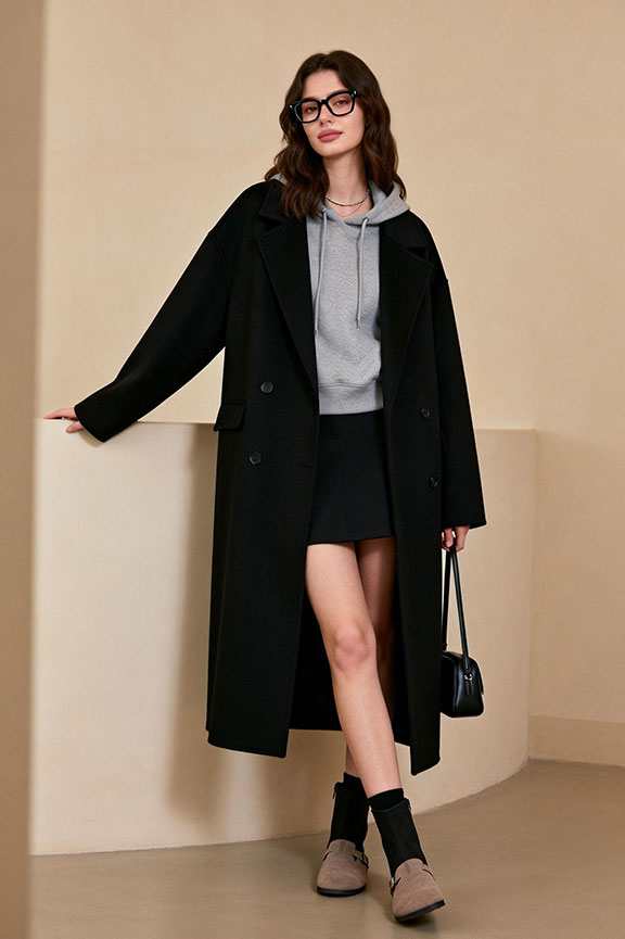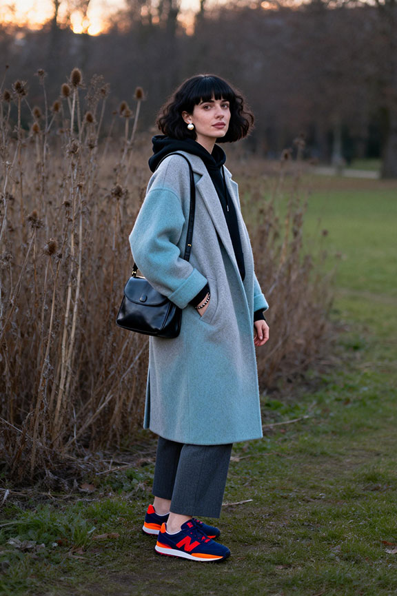 The oversized light grey coat adds structure while keeping the outfit relaxed and easy to layer. A black hoodie and dark grey straight-leg pants create a clean, streamlined base that won’t compete with the coat. Color-blocked sneakers bring a casual, playful touch and keep the look modern without feeling overstyled. This outfit works well for city errands, casual meetings, or weekend outings when you want comfort with a hint of personality.