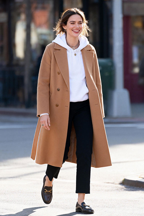 A camel coat softens the casual hoodie and instantly looks more intentional. Black trousers keep the outfit grounded and slightly sharper than denim. Loafers make this suitable for casual office settings. It’s the kind of outfit you can wear straight from work to dinner.