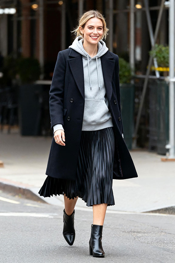 A pleated skirt adds texture and movement under the structured coat. The hoodie tones it down so the look doesn’t feel precious. Ankle boots give enough stability for walking. This outfit works well for cooler days when you want something different from pants.