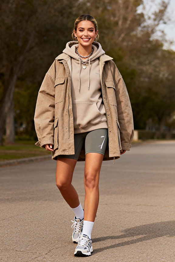 Sweat shorts work surprisingly well when balanced with a long coat. The hoodie keeps the look cohesive. Sneakers make it practical for casual days. This outfit works best for weekends or relaxed outings.