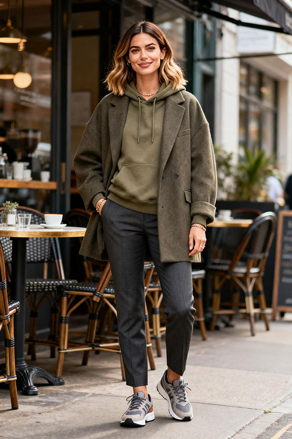 The oversized coat and hoodie combo feels relaxed, while tailored slacks keep the outfit balanced. This mix avoids looking too casual or too formal. Sneakers keep it practical for commuting. It’s a good option for creative or flexible work environments.