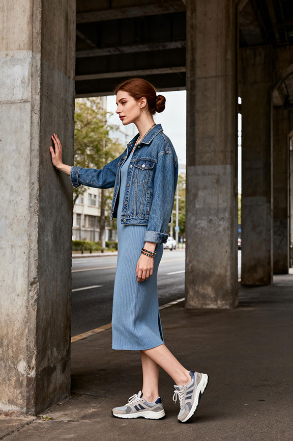 Denim Jacket + Midi Dress + Sneakers