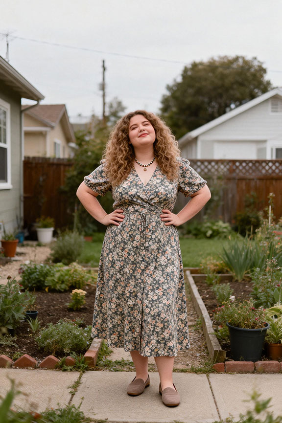 A low-contrast floral midi dress brings seasonal charm without feeling costume-like. The flowing silhouette feels comfortable for sitting or walking throughout the day. Flats keep the look grounded and practical for church services or garden parties.