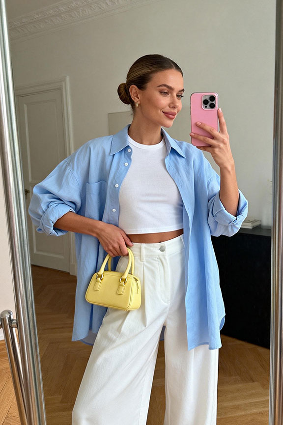 A light blue oversized shirt layered over a white cropped tee creates relaxed, breezy spring layering. Paired with white high-waisted wide-leg pants, the outfit balances loose proportions with clean, flowing ease. A yellow handbag adds a fresh pop of seasonal color.