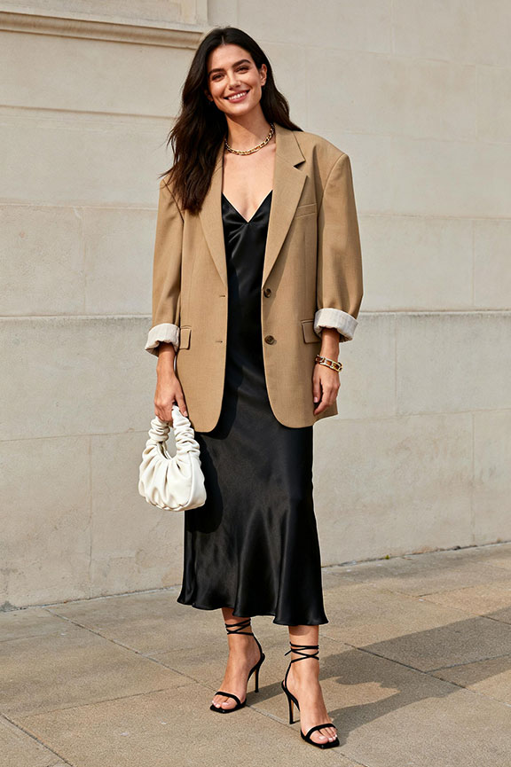 A structured blazer adds polish and sophistication over a slip dress naturally. The slip dress keeps the outfit feminine and flowing while the blazer brings intentional edge. Strappy heels complete the elevated look for special spring plans.