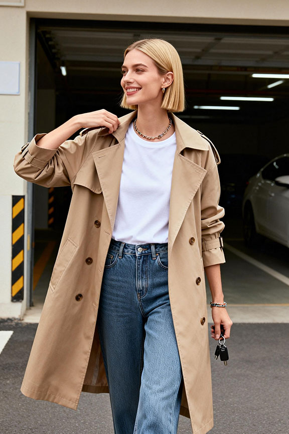 A classic trench instantly elevates a simple base without feeling overdressed. Worn over a white tee and straight jeans, it creates a clean, transitional look. Works well for unpredictable spring temperatures or early morning services.