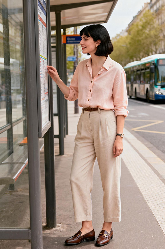 A pastel button-down offers soft color in a wearable, classic silhouette. Relaxed trousers balance comfort and polish without feeling stiff or overdone. Loafers ground the outfit naturally for spring gatherings, brunches, or casual celebrations.