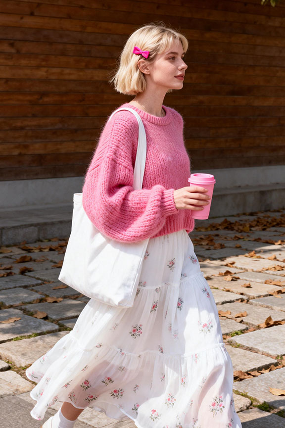 A pink oversized knit sweater with cropped length brings soft, cozy spring charm. Paired with a white flowing maxi skirt with pleated details, the outfit balances relaxed with feminine ease. A white canvas bag completes the fresh, coordinated look.