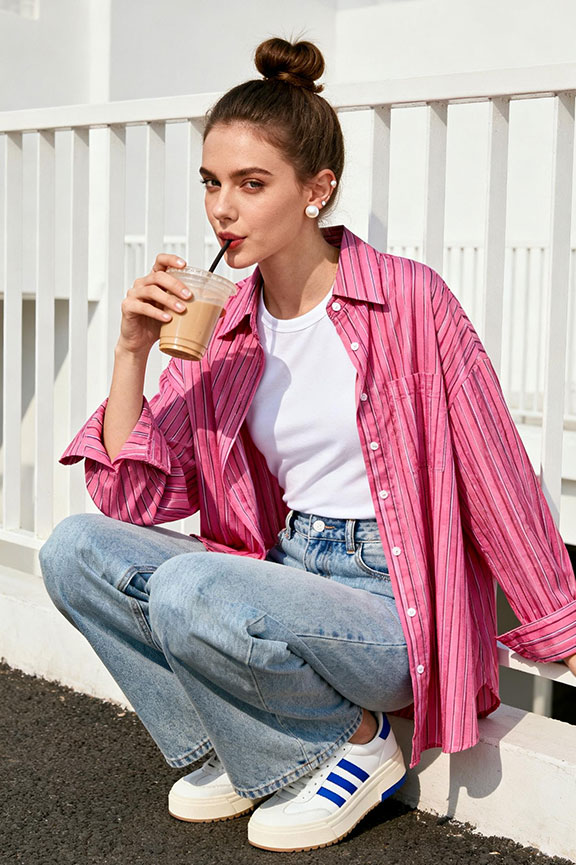 A pink striped oversized shirt layered over a white tee brings relaxed, casual spring charm. Paired with light-wash wide-leg jeans, the outfit balances loose proportions with effortless ease. White sneakers with blue details complete the coordinated, laid-back look.