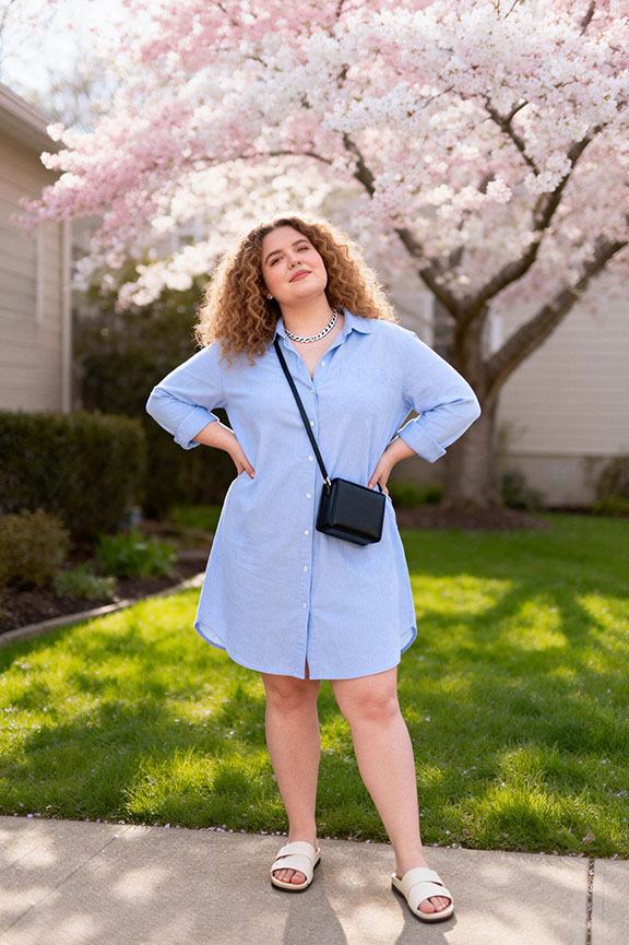 A shirt dress feels breathable, effortless, and easy to wear all day. Minimal sandals keep it light and comfortable for warm Easter afternoons. A small crossbody bag adds practicality without disrupting the clean silhouette.