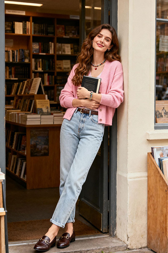 A soft pink cardigan brings gentle color while still feeling wearable and versatile. Light denim keeps the look casual and approachable, while loafers add subtle polish. Easy to repeat for spring coffee dates, errands, or relaxed weekends.