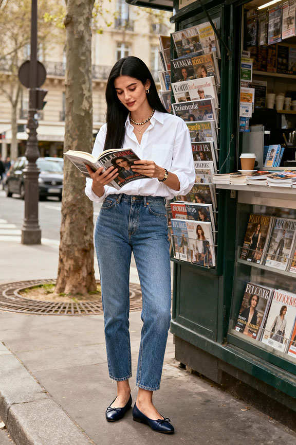 White Cotton Blouse + Classic Blue Jeans + Ballet Flats