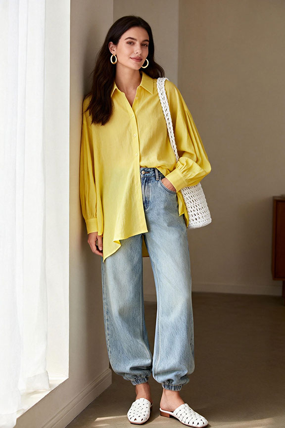 A yellow oversized shirt half-tucked brings bright, relaxed spring energy with effortless charm. Paired with light-wash wide-leg jeans, the outfit balances loose proportions with casual ease.