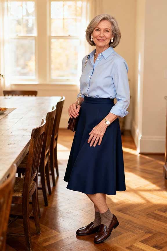 Button-up shirts with midi skirts create a classic, refined look. Loafers are practical for long family dinners. Works for both indoor and outdoor gatherings.