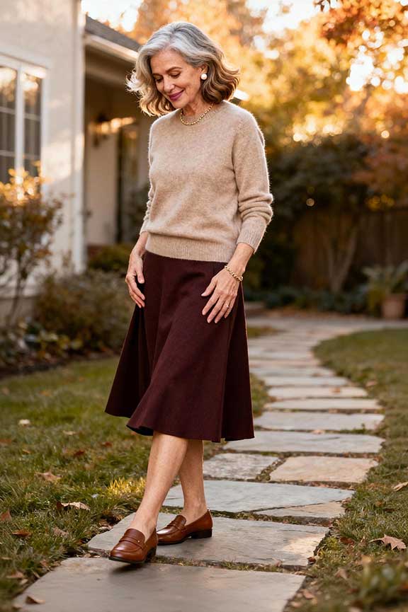 Classic A-line skirts flatter most body types. A pullover keeps you cozy. Loafers ensure comfort for long dinners or casual meetups.