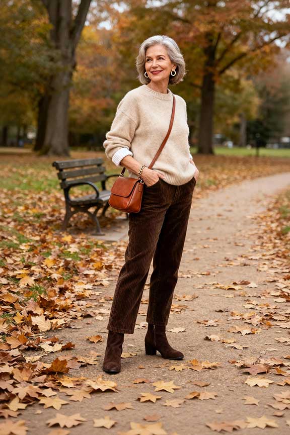 Corduroy is soft and seasonally stylish. Pair with a cozy cashmere sweater for warmth. Ankle boots complete a practical, chic look for fall walks.