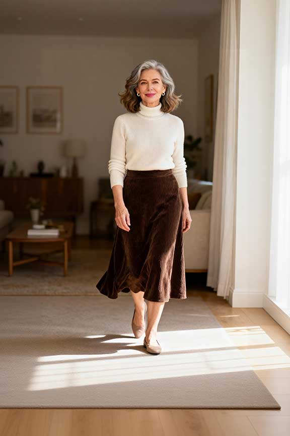 A corduroy skirt paired with a turtleneck is chic yet comfortable. Ankle boots provide practicality for walking or standing. Great for casual autumn outings.
