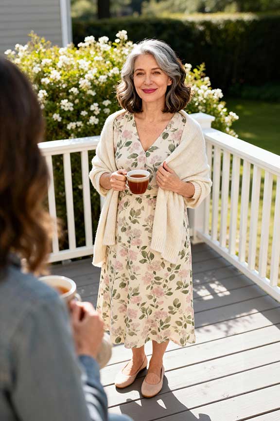 A subtle floral print keeps the outfit festive without being over the top. Layering a cardigan ensures warmth. Flats allow for ease while sitting or standing.