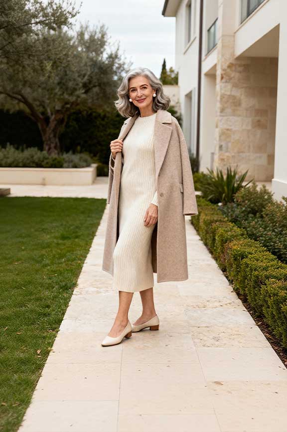 A knit dress provides a soft silhouette. Pair with a midi coat for seasonal warmth. Flats make moving around the house or venue easy.