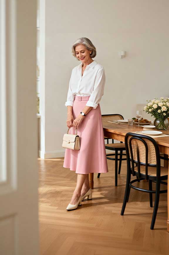 A feminine midi skirt paired with a tucked-in blouse looks polished. Block heels add height without discomfort. Great for indoor dinners or outdoor patios.