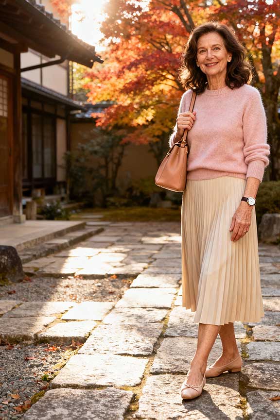 Pleats bring movement and elegance. A soft pullover keeps the look relaxed. Ballet flats are easy to wear for hours. Perfect for casual photo opportunities or daytime meals.