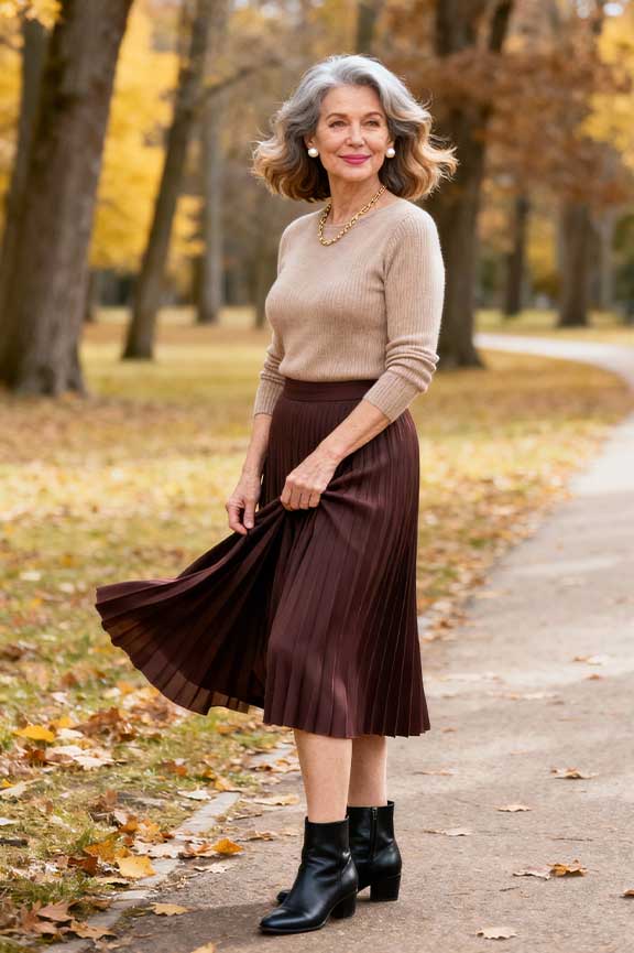 Pleated skirts move gracefully for photos. A fitted sweater balances proportions. Ankle boots keep the look chic and comfortable.