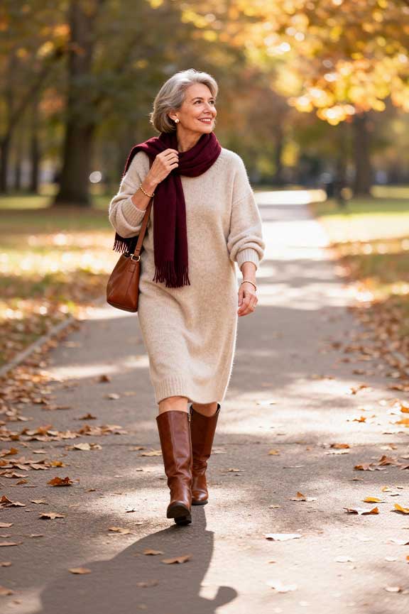 Sweater dresses are cozy and stylish. A scarf adds seasonal flair. Knee-high boots keep legs warm, suitable for outdoor autumn walks.