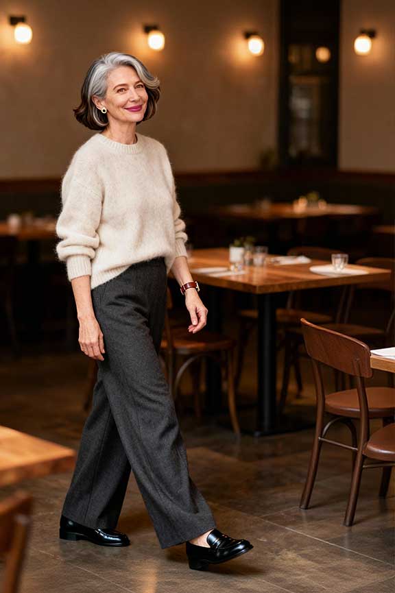 Wide-leg trousers give a relaxed silhouette. Pair with a soft sweater for warmth. Loafers make the outfit practical and stylish for family dinners.