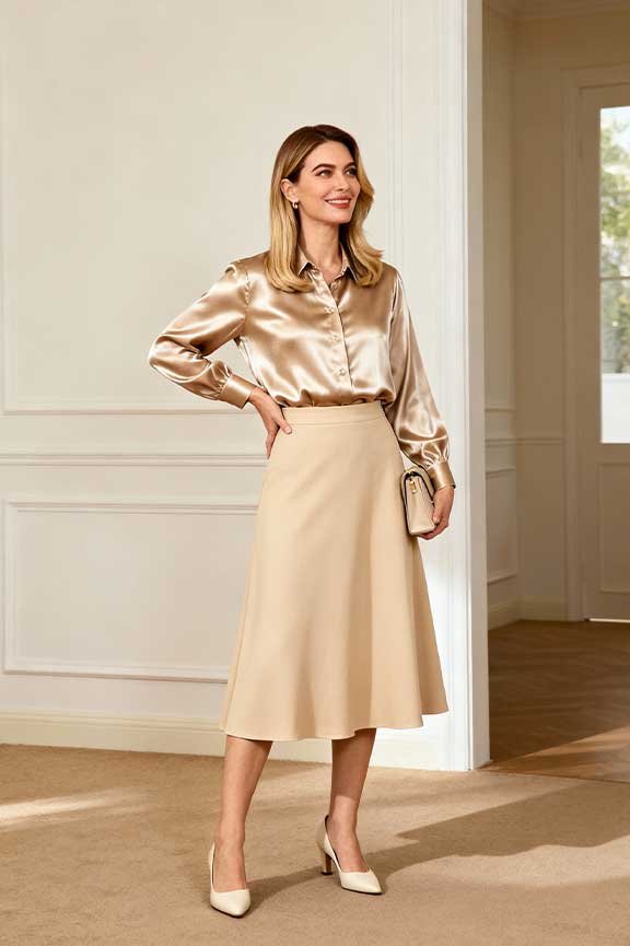 Silk adds a subtle sheen, paired with a midi skirt for ceremony-ready elegance. Monochromatic tones keep the outfit polished and photo-friendly. Beige low heels are comfortable and practical for all-day wear.