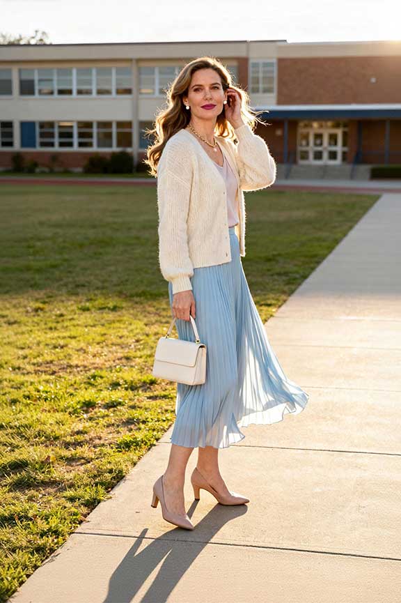 Cream knit cardigan + light blue pleated skirt + nude mid-heels