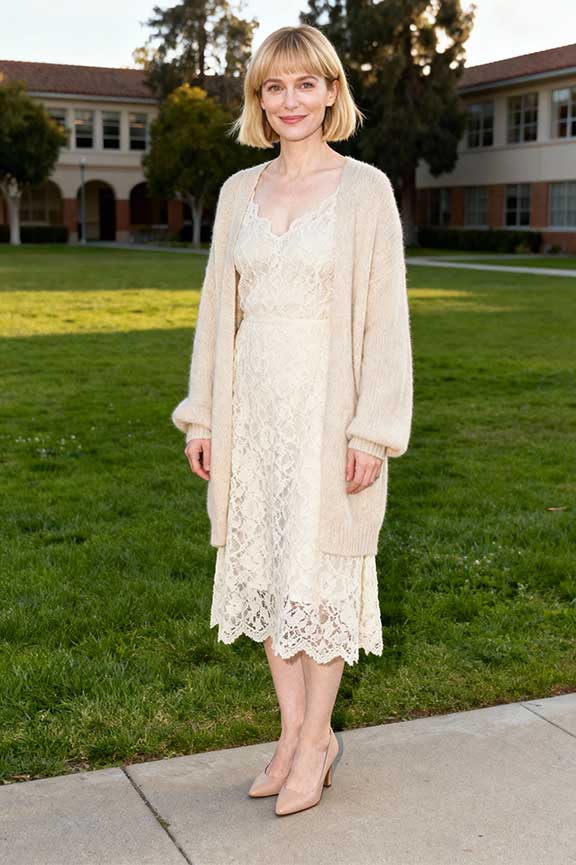 Cream lace dress + beige knit cardigan + nude mid-heels