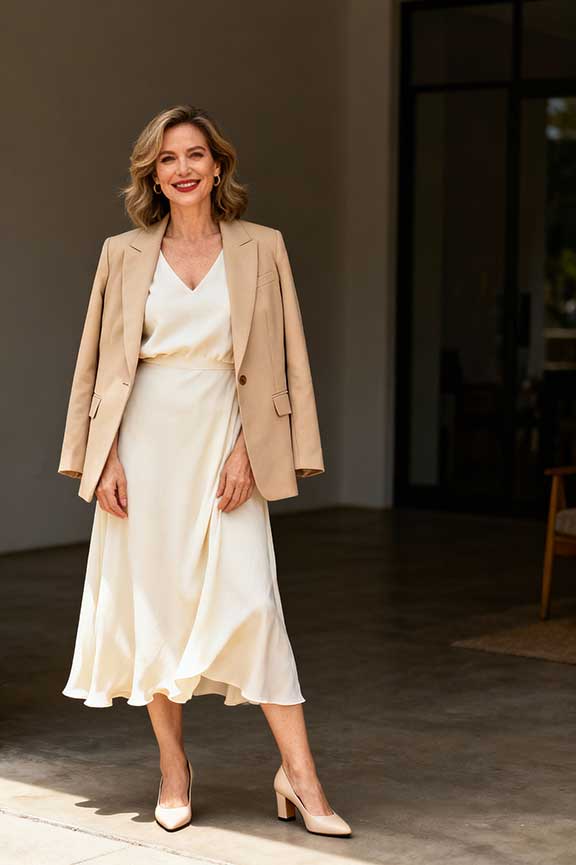 The cream midi dress flows beautifully, creating movement that looks elegant in photos. The beige blazer adds structure and polish without compromising softness. Beige mid-heel shoes are comfortable while keeping your posture poised and graceful.