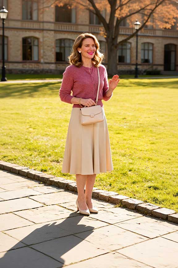 Dusty pink cardigan + beige A-line skirt + beige low heels