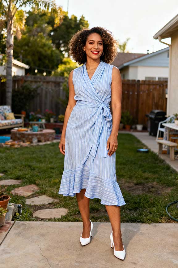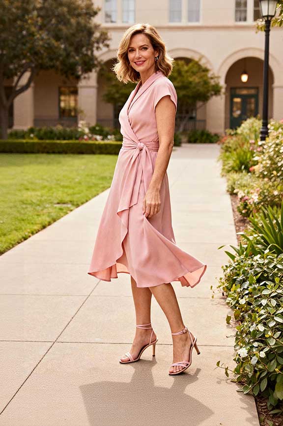 The wrap dress naturally cinches at the waist, flattering your figure without restriction. Low-heeled strappy sandals combine comfort and elegance for all-day movement.