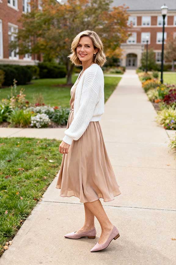 Champagne A-line dress + white lightweight cardigan + nude low heels