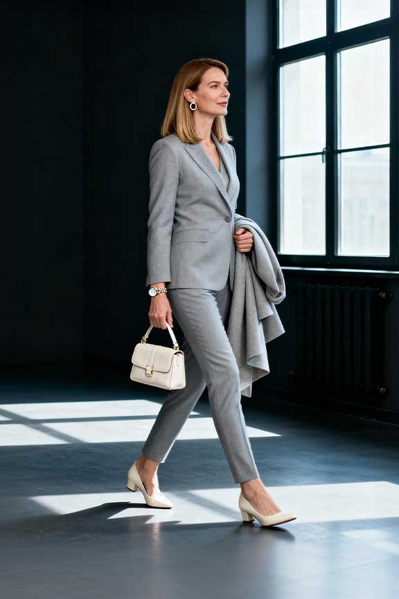 The tailored suit exudes modern elegance and confidence. High-waist pants elongate the legs, balancing proportions. Mid-heels keep you comfortable and polished from the ceremony to lunch.