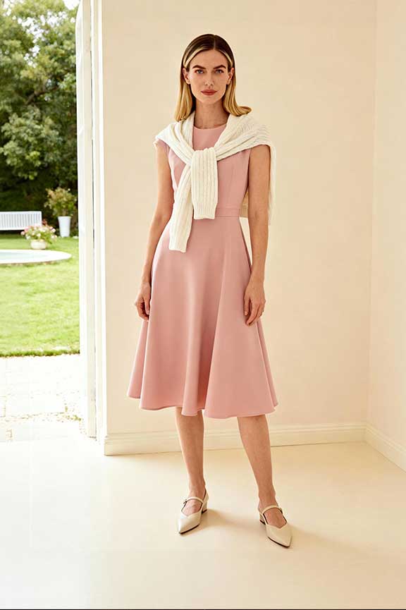 Soft pink A-line dress + ivory knit shawl + beige pointed flats