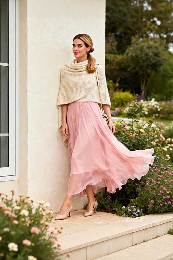 Flowing fabric moves effortlessly, adding a romantic touch to photos. A knit shawl provides warmth and visual layering. Low heels make all-day walking or outdoor events easy.