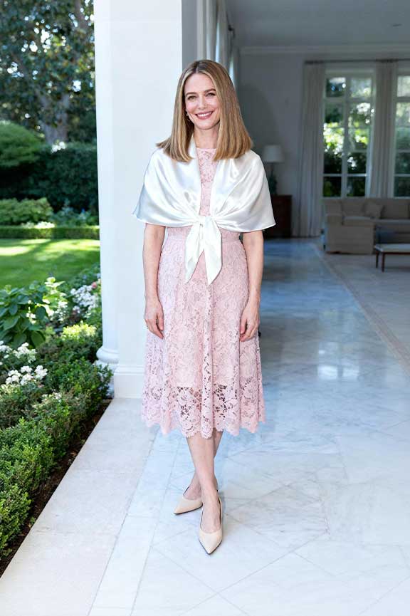 Soft pink lace dress + white silk shawl + beige pointed flats