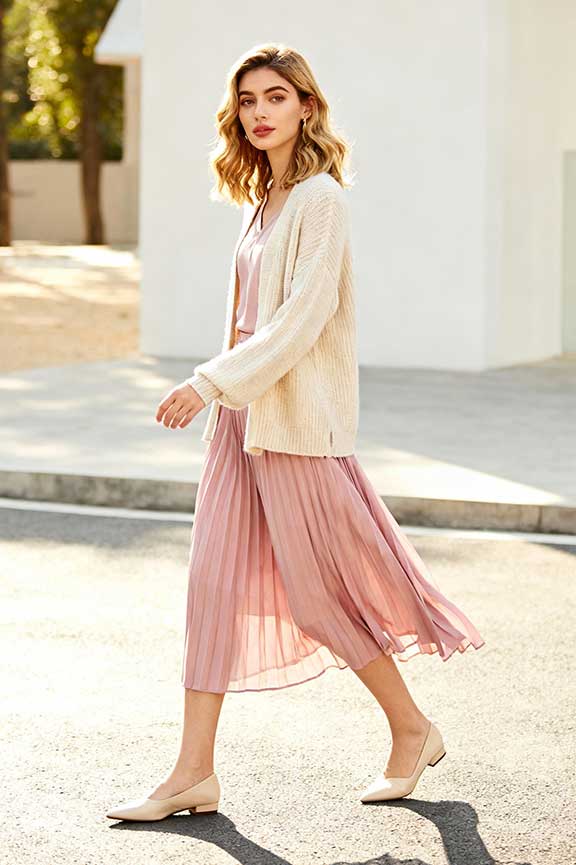 The pleated skirt adds light movement, catching the camera beautifully. A silk blouse balances the outfit with a soft, elevated feel. Beige pointed flats elongate the legs while keeping you comfortable.