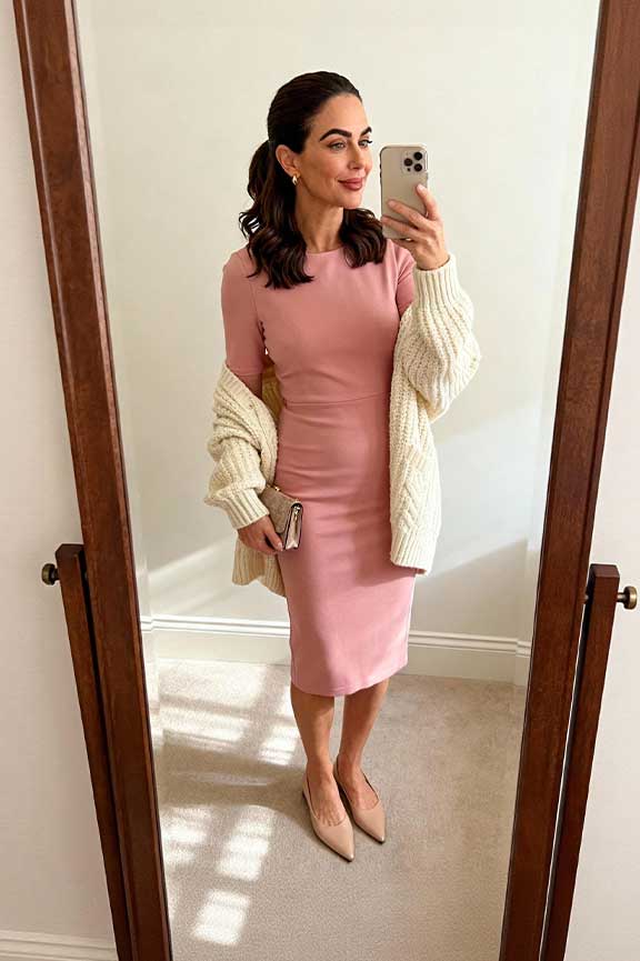 Soft pink sheath dress + cream cardigan + nude pointed flats