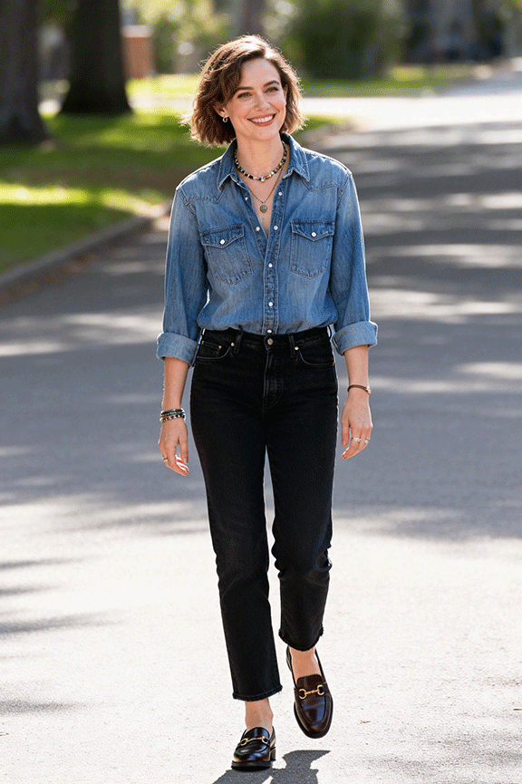 A denim shirt adds texture without being heavy. Black jeans keep the outfit sharp, and loafers finish it cleanly. This is a reliable option when you want something casual but not boring.